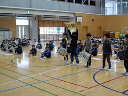 「1年生から6年生までが一緒に遊べる会があるんだよ。その名前は何というでしょう。」「正解は、ジャカジャカジャカ ジャン。」「スマイル会です。」