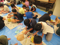 夜は、「ふくべ細工」に取り組み、思い思いの模様のお面を完成させました。