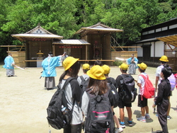 最後の見学場所は、日光江戸村です。とても暑い中でしたが、江戸時代を思わせる街並みの中でグループごとに自由に散策したり、ショーを見学したりしました。