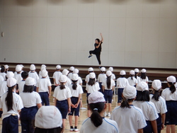 最初に、模範演技を見た後、よさこい連の方の動きに合わせて振付を覚えていきます。振付一つ一つに浦安のお祭りや生活をあらわす意味があることを丁寧に教えていただきました。戸惑っていた子ども達も練習が進んでいくと体を動かす楽しみを感じ始め、恥ずかしからずに大きな動きができるようになってきました。