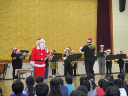 終業式後には、吹奏楽部によるクリスマスコンサートが行われました。吹奏楽部の演奏するきれいな音色を全校で聞くことができ、とてもよい時間を過ごすことができました。また、サンタクロースが登場し、吹奏楽部の演奏に合わせて歌を披露してくれるサプライズもあり、子ども達は大喜びでした。