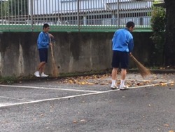 秋風が吹くようになり、それとともに学校周辺にも落ち葉が落ちる季節となってきました。今週から毎朝約1カ月日替わりで各部活動が担当となり、落ち葉清掃が始まりました。今日は野球部とバレーボール部の生徒が一生懸命落ち葉清掃をしてくれ、校門周辺の道路や広場がきれいになりました。