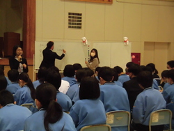 21日(木)の大掃除も終わり、いよいよ2学期最終日。体育館において、林間学校(2年生)と本校からも2名の生徒が参加した「浦安市平和学習青少年派遣事業」の発表に続き、2学期の終業式を実施しました。